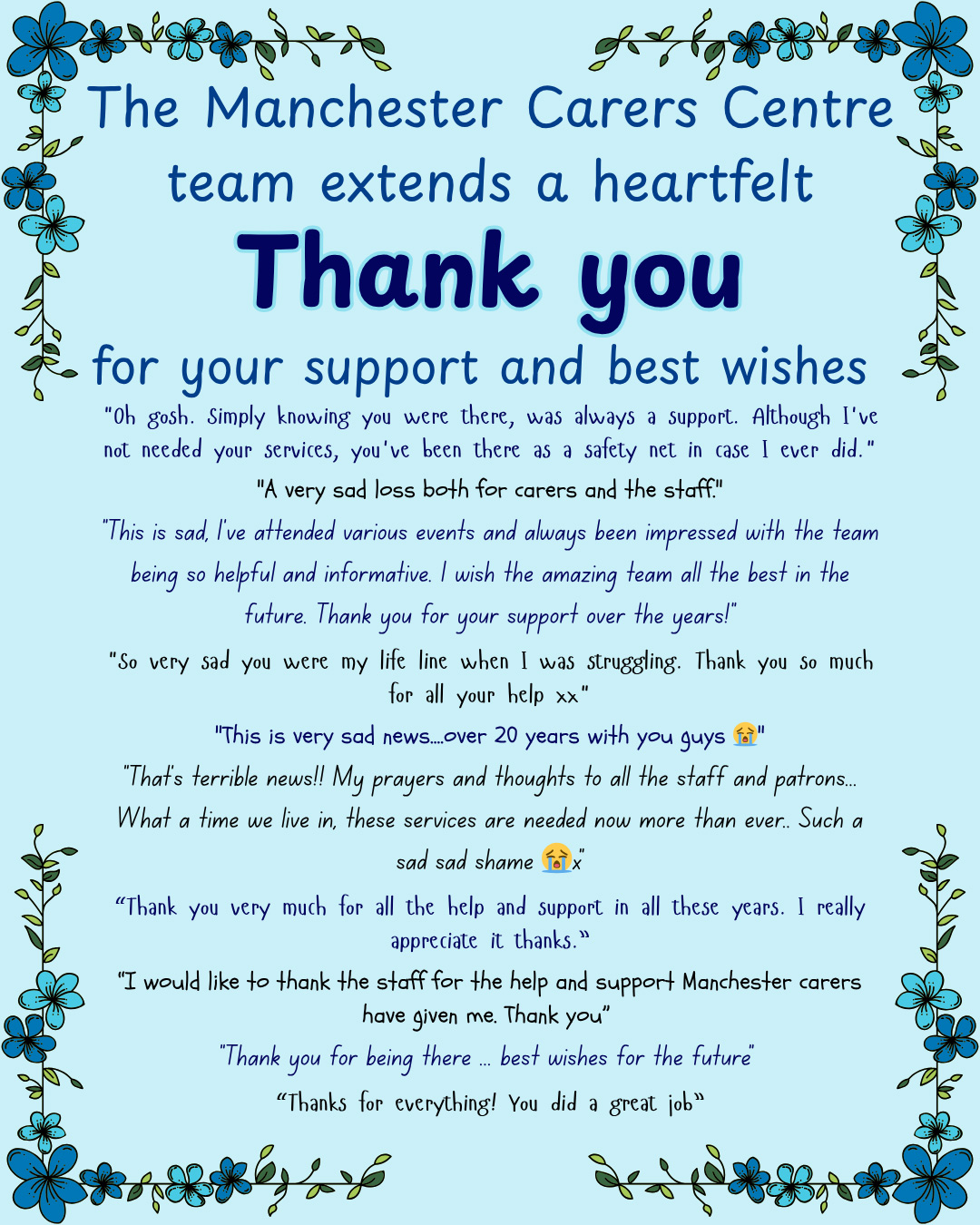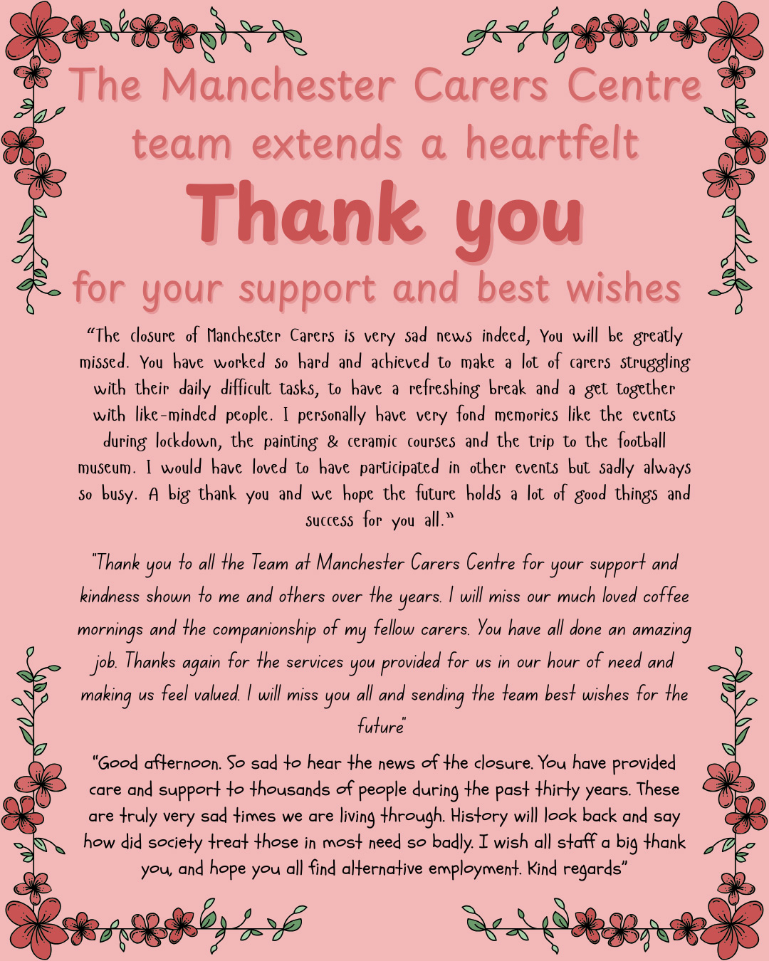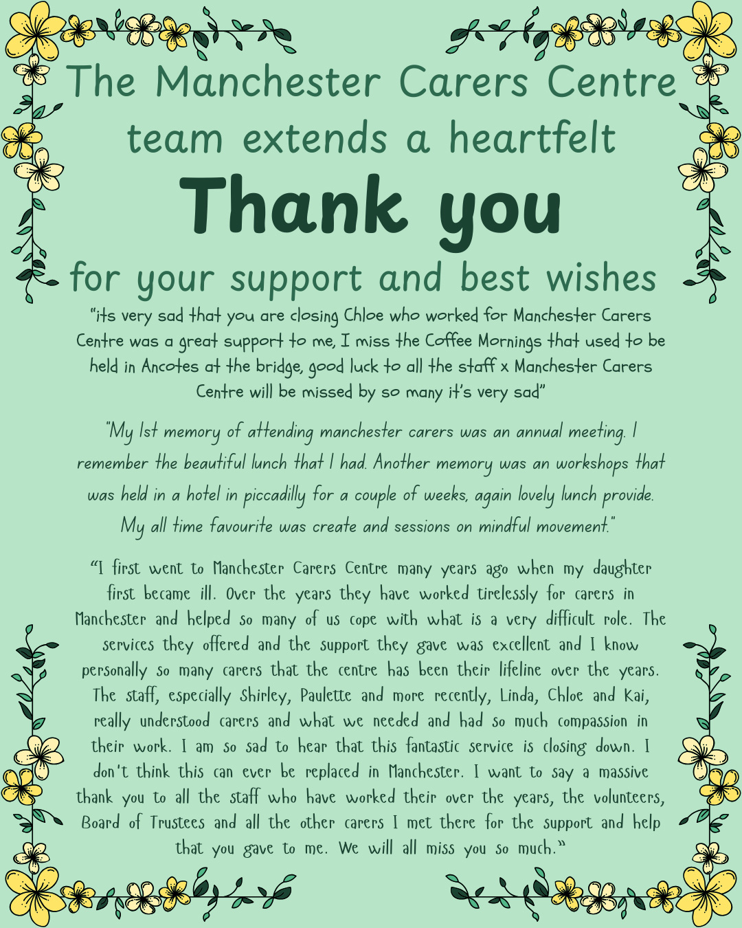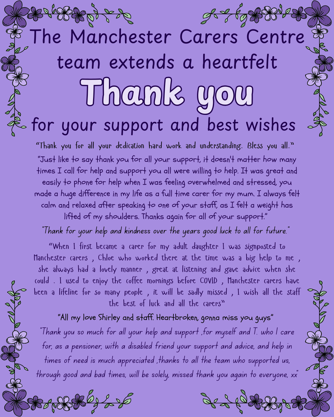 Manchester Carers Centre was established in 1997 as an independent voluntary organisation. We deliver a range of FREE, high quality support services for unpaid Carers in our City. These services include, practical help, community drop-ins, respite breaks, social activities, access to grants and training, and a dedicated Young Adult Carers Service for 16-25 year old Carers.